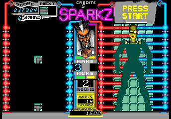 Sparks came from at Atari Brainstorming session. Original Concept was Dave Akers about connecting pipes. I and my team took it from there and flushed out the design and theme. Most of the programming was Matt Setzer with art by Mark Pierce. Norm Avellar and I did support programming. In general, I think the concept was just a little too hard for a mass market. I still think it would make a great game, but Atari never decided to do anything with it. It's earning in an arcade test just weren't high enough to justify production.